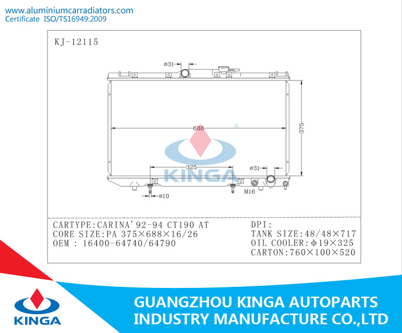 1992 Aluminium Toyota Radiator For CARINAE CT190 OEM:16400-64740/64790 AT