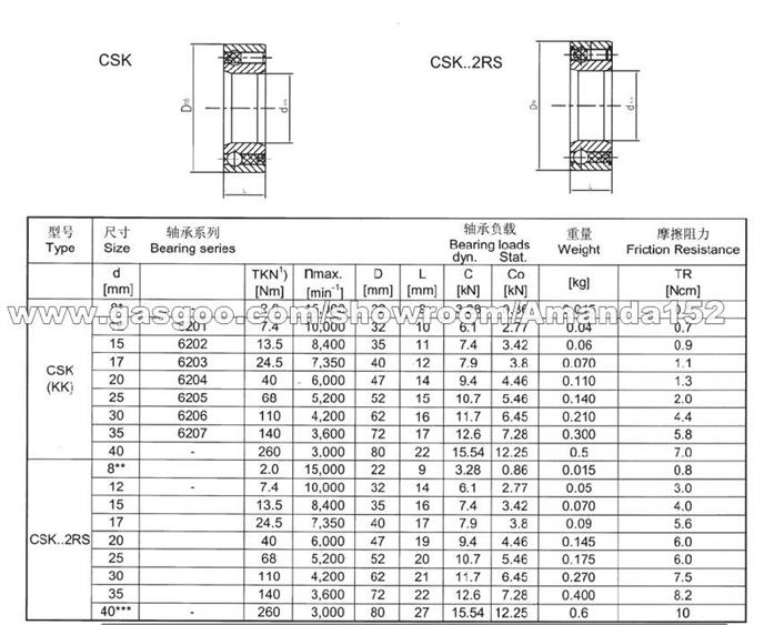 CSK series one way (direction) bearing consists of a standard ball bearing, in-built special snap block and cage, widely used in washing machine, hydraulic machinery, printing machines, textile machinery and so on.