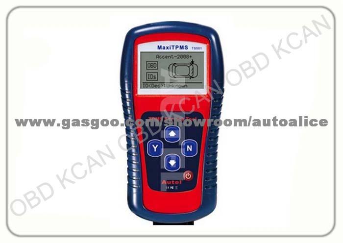 MaxiTPMS® TS501 The MaxiTPMS® TS501 diagnostic & service tool is specially designed to program vehicles that do not have a TPMS relearn facility in the ECU. It is also able to work with ALL known magnetic and frequency triggered tire sensors for ALL vehicles sold worldwide. Product Features ¡ñ¡¡Program vehicle ECU to learn sensor IDs and positions ¡ñ¡¡Activate magnetic, frequency and tire deflation triggered sensors using ¡¡¡¡125 kHz continuous or modulated wave signals ¡ñ¡¡Receive 315 MHz, 433.92 MHz and 309MHz signals ¡ñ¡¡Read sensor ID from vehicle ECU ¡ñ¡¡Read/clear codes of TPM system and reset malfunction indicator light ¡ñ¡¡Built-in rechargeable Li-ion battery ¡ñ¡¡On-screen code definitions ¡ñ¡¡Simplify the diagnostic process including four and five wheel vehicles by ¡¡¡¡showing vehicle graphs ¡ñ¡¡Decode sensor data and provide visual and audible responses to confirm ¡¡¡¡sensors are working properly ¡ñ¡¡Interpret data including sensor ID, tire pressure, temperature, battery status ¡¡¡¡and OE part number ¡ñ¡¡Pre-selection process offer faster activation and diagnostics ¡ñ¡¡Accurate diagnosing results - a tool users can trust ¡ñ¡¡1-year free upgrade on the internet via USB port ¡ñ¡¡Easy-to-use with intuitive navigation and step-by-step on-screen instructions ¡ñ¡¡Print TPMS sensor data via PC ¡ñ¡¡Automatic power-off to preserve battery life ¡ñ¡¡Proper LF signal to prevent being fooled by other RF signals ¡ñ¡¡Save up to 16 TPMS records ¡ñ¡¡If a failed sensor is detected, the tool displays the replacement part number