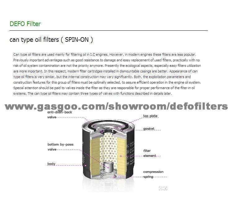 Can type oil filters are used mainly for filtering oil in I.C engines. However, in modern engines these filters are less popular. Previously important advantages such as good resistance to damage and easy replacement of used filters, practically with no risk of oil system contamination are not the priority anymore. Presently the ecological aspects, especially easy filters utilization are more important. In this respect, modern filter cartridges installed in dismountable casings are better. Appearance of can type oil filters is very similar, but the internal construction may vary significantly. Both, the exploitation parameters and construction features for this group of filters must be optimally selected, to assure efficient operation in the engine oil system. Special attention should be paid to valves inside the filter as they are responsible for proper performance of the filter in oil systems. The can type oil filters may contain three types of valves with functions described in details later.