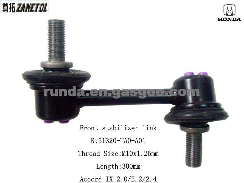 Product Name: Front Stabilizer Link R:51320-TAO-A01 HONDA Accord Product Attribute: Position:Front Thread Size:300mm Application: Honda accord Product Description: Front Stabilizer Link R:51320-TAO-A01 HONDA Accord 1Quality is steady (high quality). 2competitive price. 3Quick Delivery term. 4Best servive 5Brand name: ZANETOL 6Feel free to come to our company to check the products quality. If you are interested in this REAR STABILIZER LINK , please feel free to get touch with me . Place of Origin: ZHEJIANG China (Mainland) Brand Name:ZANETOL Type: STABILIZER LINK Type: STABILIZER LINK Description STABILIZER LINK STABILIZER LINK for Fully automatic engine This STABILIZER LINK is applicate in HONDA accord TheSTABILIZER LINK is a crucial part of your CAR.