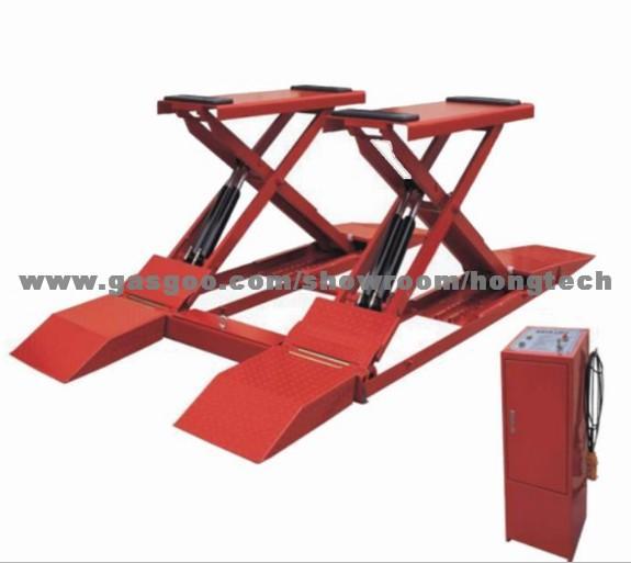 MEE102 3Ton Super Thin Scissor Lift which adopted oversea technologies and manufactured under strict monitor. 1750mm maximum lifting height lifts the car only need 12seconds.