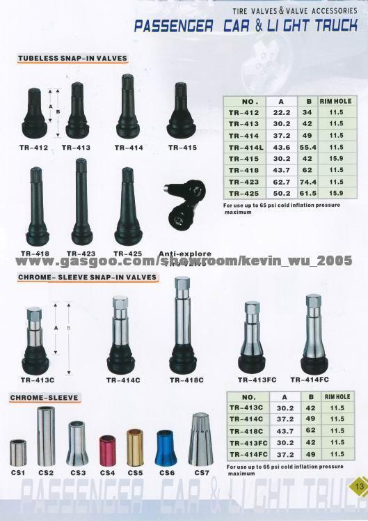 snap- In tubeless tyre valve series of TR412, TR413, TR414, TR415, TR418, TR423, TR425. Rubber base import from Thailand. Material is EPDM 30%. C/ E Cap as your request. Chrome- Sleeve snap in valves such as TR413C, TR414C, TR418C, TR413FC, TR414FC. Rim hole is 11. 5.