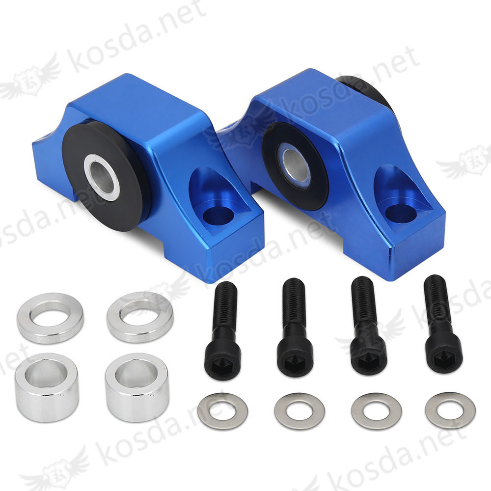 -Comes with High Density Wear Resistant Polyurethane bushing inserts, with billet aluminum bolt sleeves. Mounts under the front rail and replaces the weak O.E.M. mounts.