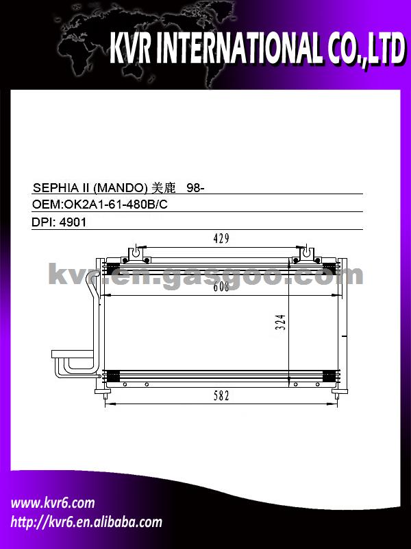 Condenser For Hyundai MODEL: SEPHIA II/MENTOR (MANDO) 98-01 O E M : OK2A1-61-480B/OK2A1-61-480C D P I : 4901 NISSENS : 94419