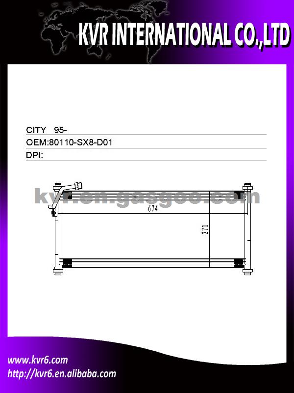 Condenser Specifications: 1. Oem number: 80110-SX8-D01 2. Suitable for: 95- CITY 3. Aim market:Euro,Middleeast,Russia,Middle&South America 4. Gurantee: 1 year warranty against B/L date We are a professional exporter and supplier of auto spare parts. We are a subsidiary company of HK Weirui Holdings. We mainly Produce auto radiator, auto heater, auto condenser, auto evaporator,intercooler and Truck radiator for the cooler parts, at the same time our Group invest our new plants on auspension parts, such as CV joint, Shock absorber, clutch, we have export many in 2012 , Our high quality parts have been distributed to clients in many countries and areas, such as Europe, America, South America, Africa, the Middle East and Taiwan area.