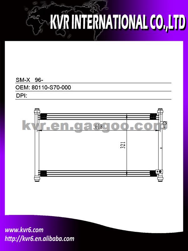 Condenser Specifications: 1. Oem number: 80110-S70-000 2. Suitable for:96- SM-X 3. Aim market:Euro,Middleeast,Russia,Middle&South America 4. Gurantee: 1 year warranty against B/L date We are a professional exporter and supplier of auto spare parts. We are a subsidiary company of HK Weirui Holdings. We mainly Produce auto radiator, auto heater, auto condenser, auto evaporator,intercooler and Truck radiator for the cooler parts, at the same time our Group invest our new plants on auspension parts, such as CV joint, Shock absorber, clutch, we have export many in 2012 , Our high quality parts have been distributed to clients in many countries and areas, such as Europe, America, South America, Africa, the Middle East and Taiwan area.