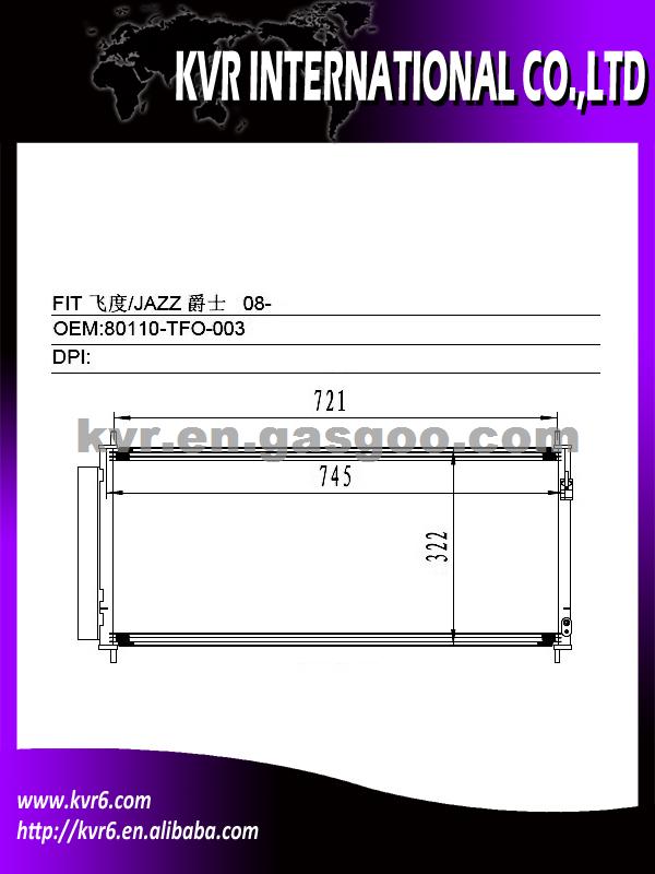 Condenser Specifications: 1. Oem number: 80110-TF0-003/80110-TF0-013 2. Suitable for:08- FIT /JAZZ 3. Aim market:Euro,Middleeast,Russia,Middle&South America 4. Gurantee: 1 year warranty against B/L date 5. NISSENS:940240 6. AVA: HD5264 We are a professional exporter and supplier of auto spare parts. We are a subsidiary company of HK Weirui Holdings. We mainly Produce auto radiator, auto heater, auto condenser, auto evaporator,intercooler and Truck radiator for the cooler parts, at the same time our Group invest our new plants on auspension parts, such as CV joint, Shock absorber, clutch, we have export many in 2012 , Our high quality parts have been distributed to clients in many countries and areas, such as Europe, America, South America, Africa, the Middle East and Taiwan area.