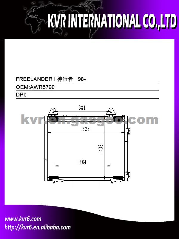 Condenser Specifications: 1) Suitable for:LAND ROVER 97-00 FREELANDER I 2) Oem number:AWR5796 3) Nissens:94327 4) Aim market:Euro,Middleeast,Russia,Middle&South America 5) Gurantee:1 year warranty against B/L date