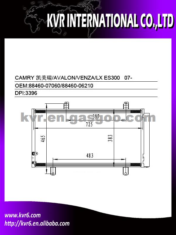 Condenser Specifications: 1. Oem number:88460-07060/88460-06210 2. Suitable for:07-11 CAMRY /AVALON /VENZA 3. Aim market:Euro,Middleeast,Russia,Middle&South America 4. Gurantee: 1 year warranty against B/L date 5. NISSENS: 940194 6. DPI :3396 We are a professional exporter and supplier of auto spare parts. We are a subsidiary company of HK Weirui Holdings. We mainly Produce auto radiator, auto heater, auto condenser, auto evaporator,intercooler and Truck radiator for the cooler parts, at the same time our Group invest our new plants on auspension parts, such as CV joint, Shock absorber, clutch, we have export many in 2012 , Our high quality parts have been distributed to clients in many countries and areas, such as Europe, America, South America, Africa, the Middle East and Taiwan area.