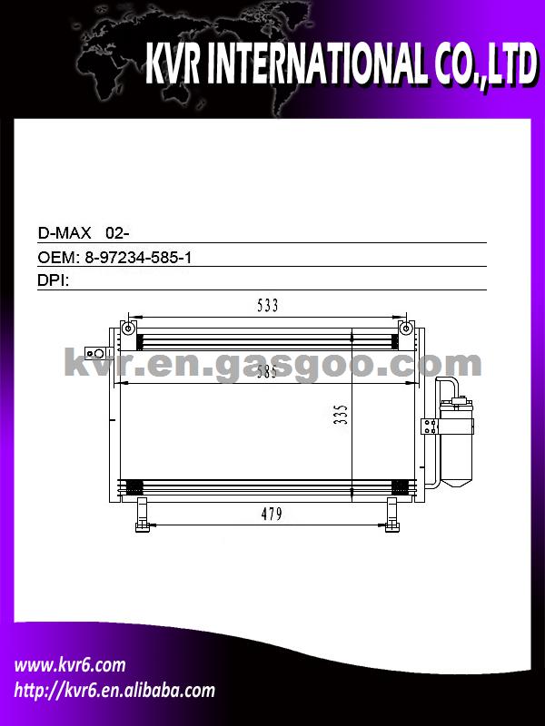 Condenser Specifications: 1. Oem number: 8-97234-585-1 2. Suitable for:02- D-MAX 3. Aim market:Euro,Middleeast,Russia,Middle&South America 4. Gurantee: 1 year warranty against B/L date We are a professional exporter and supplier of auto spare parts. We are a subsidiary company of HK Weirui Holdings. We mainly Produce auto radiator, auto heater, auto condenser, auto evaporator,intercooler and Truck radiator for the cooler parts, at the same time our Group invest our new plants on auspension parts, such as CV joint, Shock absorber, clutch, we have export many in 2012 , Our high quality parts have been distributed to clients in many countries and areas, such as Europe, America, South America, Africa, the Middle East and Taiwan area.