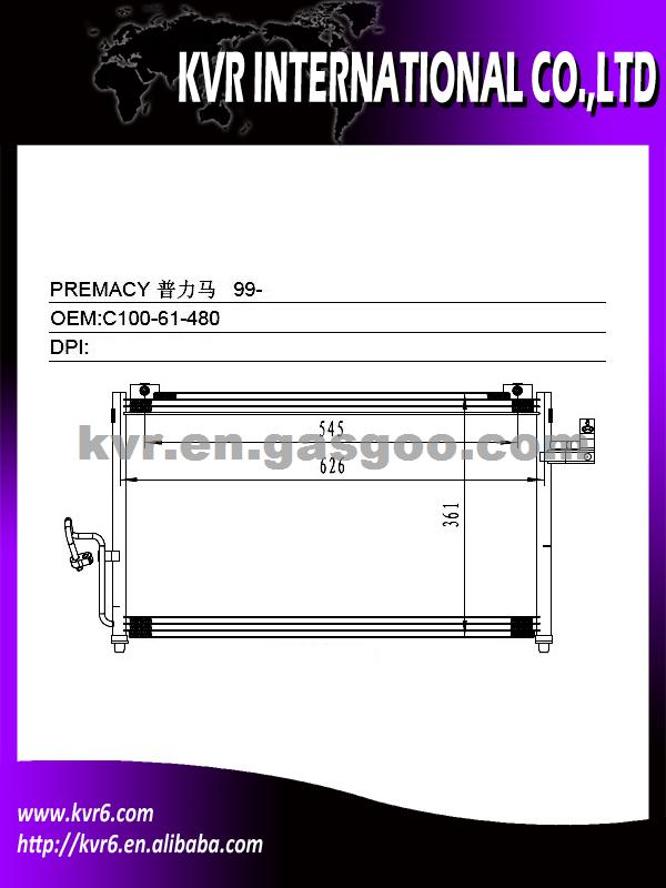 Condenser Specifications: 1. Oem number: C100-61-480 2. Suitable for:99- PREMACY 3. Aim market:Euro,Middleeast,Russia,Middle&South America 4. Gurantee: 1 year warranty against B/L date 5. NISSENS:94742 6. AVA : MZ5159 We are a professional exporter and supplier of auto spare parts. We are a subsidiary company of HK Weirui Holdings. We mainly Produce auto radiator, auto heater, auto condenser, auto evaporator,intercooler and Truck radiator for the cooler parts, at the same time our Group invest our new plants on auspension parts, such as CV joint, Shock absorber, clutch, we have export many in 2012 , Our high quality parts have been distributed to clients in many countries and areas, such as Europe, America, South America, Africa, the Middle East and Taiwan area.