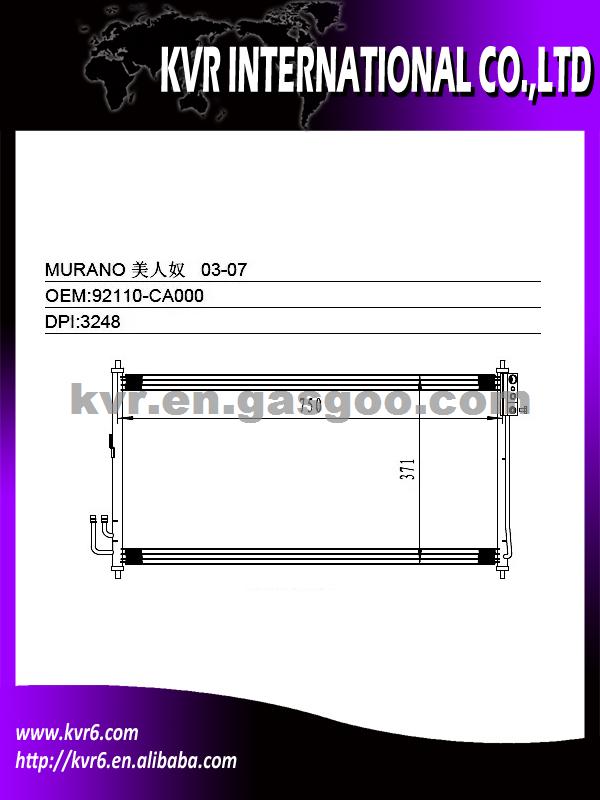 Condenser Specifications: 1. Oem number: 92110-CA000 2. Suitable for:03-07 MURANO 3. Aim market:Euro,Middleeast,Russia,Middle&South America 4. Gurantee: 1 year warranty against B/L date 5. DPI :3248 6. NISSENS:94907 7. AVA: DN5325 We are a professional exporter and supplier of auto spare parts. We are a subsidiary company of HK Weirui Holdings. We mainly Produce auto radiator, auto heater, auto condenser, auto evaporator,intercooler and Truck radiator for the cooler parts, at the same time our Group invest our new plants on auspension parts, such as CV joint, Shock absorber, clutch, we have export many in 2012 , Our high quality parts have been distributed to clients in many countries and areas, such as Europe, America, South America, Africa, the Middle East and Taiwan area.