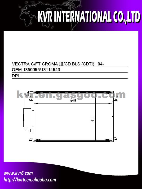 Condenser Specifications: 1) Suitable for:OPEL 04- VECTRA C / FIAT 04- CROMA III (TD) 2) Oem number:1850095/13114943 3) Nissens:94598+DRIER 4) AVA:OLA5397/OL5397 5) Aim market:Euro,Middleeast,Russia,Middle&South America 6) Gurantee:1 year warranty against B/L date