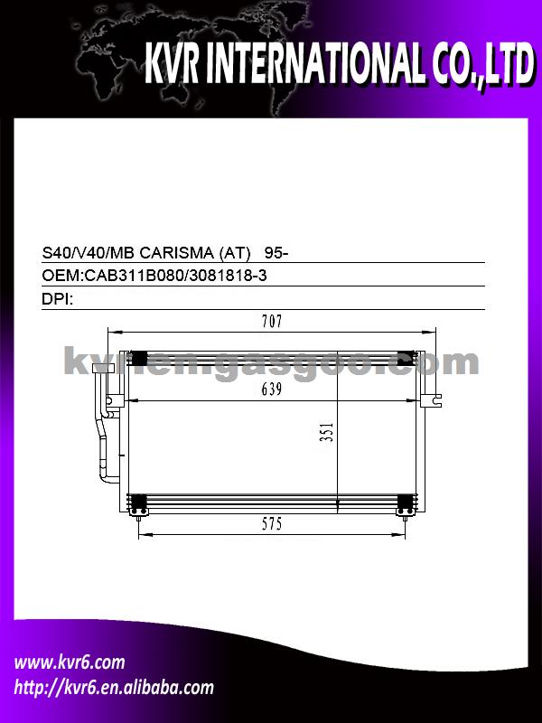 Condenser Specifications: 1) Suitable for:VOLVO 95- S40/V40 (AT) / MITSUBISHI 95- CARISMA (A/T) 2) Oem number:CAB311B080/3081818-3 3) Nissens:94306 4) AVA:VO5094 5) Aim market:Euro,Middleeast,Russia,Middle&South America 6) Gurantee:1 year warranty against B/L date