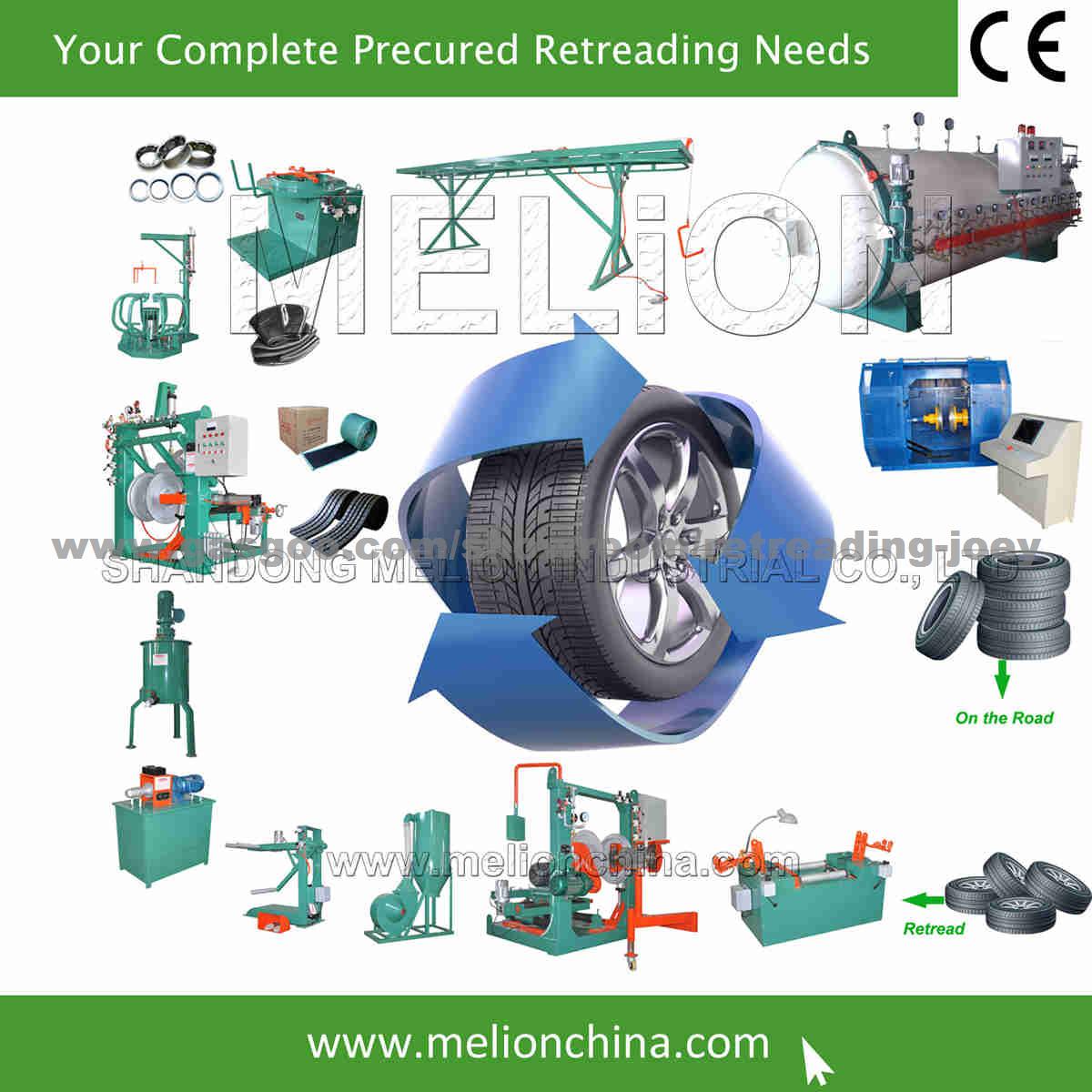 Collection of Casings Initial Inspection Buffing Section Repairs & Skiving Cementing & Filling Building - Tread Rubber a. Enveloping & Rim Mounting or b. Double Envelope System Curing by Chamber Final Inspection & Painting 1. Collection of Casings Worn tyres are collected to select suitable casings for tyre retread. 2. Initial Inspection Each tyre received in a retread plant is subjected to a rigorous visual inspection. Inspectors are assisted by the use of non-destructive sophisticated MELION inspection machine. 3. Buffing After inspectionThe tyre's old tread is mechanically removed on high speed buffers. MELION's buffers are extremely accurate and will remove the proper amount of old rubber while turning the tyre to an exact specified diameter and radius. 4. Section Repairs & Skiving With advances in state-of-the-art repair materials and repair methods, many of these tyres can be routinely repaired and in most cases can be retreaded when the original tread is worn off. The repair station is where any surface injury is treated using effective material and tools for grinding and patching. 5. Cementing and Filling Even in small injuries it is critical that the injury is cleaned and filled. If this is not done, severe rust, separation and steel cable looseness could take tyre out of service. The injury should be inspected, and then cleaned out with a carbide cutter. After cementing the injury, a vulcanizing rubber stem should be applied to "fill" the injury. This would create a permanent repair that maximizes tyre life. With MELION designed-and-built spray booth, your cementing operation can be executed in a clean, efficient & environmentally responsible manner. 6. Building - Tread RubberIn the pre-cure system, the tread rubber has already been vulcanized with the new tread pattern design. The buffed tyre needs a thin layer of cushion gum to be wrapped around its crown area. The pre-cured tread rubber is then applied with the building machine. This is called the building process. 7.a) Enveloping & Rim Mounting The built tyres are then mounted with envelops and rims to prepare them for curing. b) or Double Envelope SystemFor enveloping, tyres are first fitted an outer envelope at the envelope-mounting table before the inner envelope is fitted into them. The enveloped tyres are then vacuumed out for preparation prior to curing. Modern plants have their casings hoisted by monorail systems. With professional planning from MELION engineers, you can be assured of workstations designed to maximize output and ease workflow. 8. Curing by Chamber The tyre is then placed in a curing chamber and the pre-cured tread becomes adhered to the tyre through a vulcanizing process. Our wide engineering capabilities and experience enable MELION to build chambers to suit our clients' different preferences for size, steam heated, electric heated, or double heating system, semi-automatic and automatic chambers.