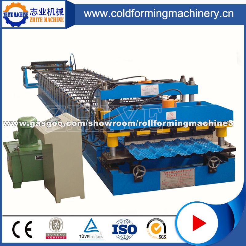 Glazed tile produced by this kind of machine are looked beautiful, elegant and noble. It can be widely used in garden-style factory, traveling scenic spots, hotel, exhibition center, villa, civil construction and so on.It consists of feeding platform, main molding core, shearing mechanism, hydraulic station, computer control cabinet, glazed tile roll forming machine, high precision counter and so on. Function and feature This producing line uses galvanized steel sheet, colored armor plate or aluminum plate as the material plate. The products of it are used as the roof tile and wall panel outside of building, to increase the beauty and durability of the roof tile and wall panel. This line has no limit on processing length; you can set several different data on the computer control cabinet according to your own need. After pressing the button "Confirm", the machine can produce the panel automatically according to the set data. The molding plate surface smooth and not easy to be marked when it is being stamped. So it is easy to install. The product conforms to National Steel Construction Building Standard. Features of this producing line:lower cost high efficiency reliable working low energy consumption Technical parameters:Material spec:colored steel sheet,galvanized steel sheetchargein m Thickness of coil sheet:0.4---0.8mm Main motor power:4kwForming speed:8--10m/min Hydraulic station power:3kw Quantity of stands:about 12 groups Hydraulic pressure:58mpa Controlling system:PLC Index error of length:10m±2mmTotal weight:about4,300kg Voltage:380V3 phase 50Hz or at buyers requirement Material of main equipment:Roller material: high grade No.45 forged steel,plated hard chrome on the surface of roller with thickness 0.05mm Active shaft material: high grade No.45 carbon wrought steel at diameter 70mm Cutter blade:Cr12 mould steel with quenched treatment Glazed tile stamping:Cr12 mould steel with quenched treatment,Frequency converter PLC:computer adopt PLCComputer operating board adopt OP320A,China Processing technique and deployment:Uncoiler Feeding platform Molding core Molding shearing mechanism Hydraulic station Computer control cabinetStep-formed mechanism Counter Working flow:Decoiling the sheet--sheet guiding---roll forming---measure length---glazed steel stamping--cutting ---the panel---panels to the supporter Features of Roof Tile ProductThe roofing tile products are formed by cold roll forming machine from high quality coated sheet, which performs the elegant style of traditional roof tile and suits for every architecture design. With light, strong strength and long lasting quality, it is convenient and takes short time for installation.