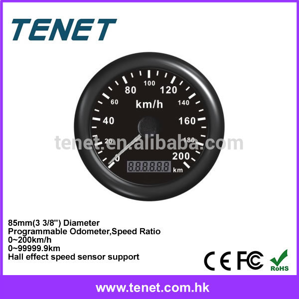 Special electronic speedometer with odometer in LCD display.Mounting hole 85mm. Black front & dial, white scale and pointer.a.Electronic Speedometer, Support getting Speed Signal from GPS antenna/GPS Senderb.Total Mileage Programmablec.Calibration(imp/km) Programmabled.Installation Diameter: 85mm(3 3/8”) e.Speed Range: 0~200KM/Hf.Mileage Range: 0-99999.9KMg.Operating temperature:-40°C~+85°Ch.Protection Rank: IP67i.Reverse polarity protection