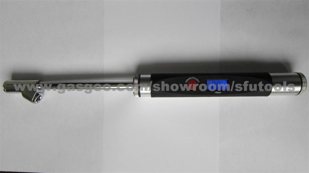 Product Description Pressure range:0-200psi,0-14bar,0-995kpa,0-14kgf/cm² Pressure unit: psi,bar,kpa,kgf/cm²(optional) Resolution:1psi/0.1bar/5kpa/0.1kgf/cm² Back-Lit LCD for easy use Power:CR2032 3V lithium coin cell On/off key Auto shut off Accuracy:±2 psi F.S. Product size: 33*2.6*2.8 cm Net weight: 163 g Each in sliding blister Dimensions of master carton: 41*23.5* 15cm 20pcs/ctn G.W.: 5kgs N.W.:4 kgs Product Feature Swivel head design Same design and function as standard straight-on service gauge Easy to read backlit digital display Reads in PSI, bar, kilopascal and kilogram-force/cm2 Swivel head design enables tire valves to be reached from all directions Same design and function as standard straight-on service gauge, but now with the convenience of an easy to read backlit digital display. Reads in PSI, bar, kilopascal and kilogram-force/centimeter square. Swivel head design enables tire valves to be reached from all directions.