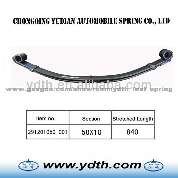 1.material: SUP9 2.WidthxThicness: 50x10 3.the sizes: 840 Parabolic springs are made as follows: 1.Shearing of flat bar 2.Parabolic Rolling 3.Center hole punching / Drilling 4.End Heating process forming (hot & cold process) a. Eye Forming / Wrapper Forming b. Diamond cutting / end trimming / width cutting / end tapering c. End punching / end grooving / end bending / end forging / eye grinding d. Center hole punching / Drilling / nibbing 5.Heat Treatment a. Heating b. Camber forming c. Quenching d. Tempering 6.Surface preparation a. sand blasting b. Painting 7.Eye bush preparation process a. Eye reaming / eye boring b. Bush insertion c. Bush reaming 8.Assemble a. Presetting & load testing b. Paint touch-up c. Marking & packing