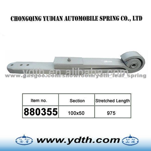 1.material: SUP11A 2.Width& Thicness: 100x50 3.the sizes: 975/500/320/50/70 Z type leaf springs are made as follows: 1.Shearing of flat bar 2.Parabolic Rolling 3.Center hole punching / Drilling 4.End Heating process forming (hot & cold process) a.Eye Forming / Wrapper Forming b.Diamond cutting / end trimming / width cutting / end tapering c.End punching / end grooving / end bending / end forging / eye grinding d.Center hole punching / Drilling / nibbing 5.Make Z 6.Heat Treatment a. Heating b. Camber forming c. Quenching d. Tempering 6.Surface preparation a. sand blasting b. Painting 7.Eye bush preparation process a. Eye reaming / eye boring b. Bush insertion c. Bush reaming 8.Assemble a. Presetting & load testing b. Paint touch-up c. Marking & packing
