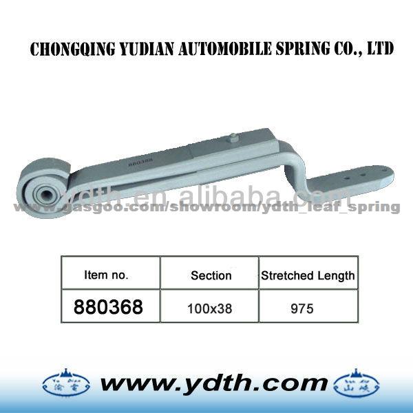 1.material: SUP11A 2.Width& Thicness: 100x38 3.the sizes: 975/500/320/50/70 Z type leaf springs are made as follows: 1.Shearing of flat bar 2.Parabolic Rolling 3.Center hole punching / Drilling 4.End Heating process forming (hot & cold process) a.Eye Forming / Wrapper Forming b.Diamond cutting / end trimming / width cutting / end tapering c.End punching / end grooving / end bending / end forging / eye grinding d.Center hole punching / Drilling / nibbing 5.Make Z 6.Heat Treatment a. Heating b. Camber forming c. Quenching d. Tempering 6.Surface preparation a. sand blasting b. Painting 7.Eye bush preparation process a. Eye reaming / eye boring b. Bush insertion c. Bush reaming 8.Assemble a. Presetting & load testing b. Paint touch-up c. Marking & packing