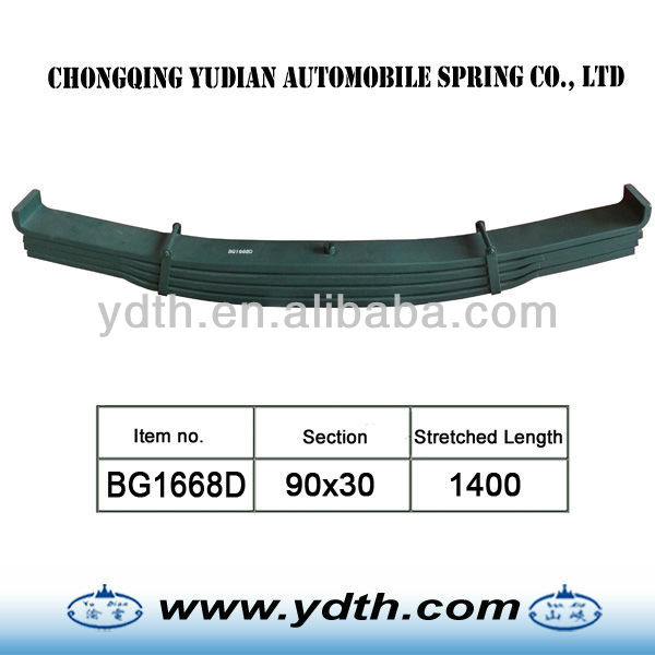 1.material: SUP11A 2.WidthxThicness: 90x30 3.the sizes: 1400 this is improved leaf spring for bogie.the capability is 8 tons Parabolic springs are made as follows: 1.Shearing of flat bar 2.Parabolic Rolling 3.Center hole punching / Drilling 4.End Heating process forming (hot & cold process) a. Eye Forming / Wrapper Forming b. Diamond cutting / end trimming / width cutting / end tapering c. End punching / end grooving / end bending / end forging / eye grinding d. Center hole punching / Drilling / nibbing 5.Heat Treatment a. Heating b. Camber forming c. Quenching d. Tempering 6.Surface preparation a. sand blasting b. Painting 7.Eye bush preparation process a. Eye reaming / eye boring b. Bush insertion c. Bush reaming 8.Assemble a. Presetting & load testing b. Paint touch-up c. Marking & packing