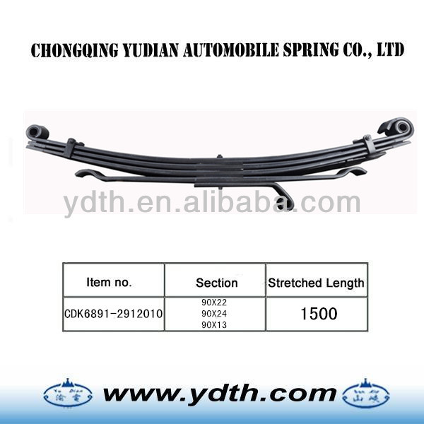 1.material: SUP9 2.WidthxThicness: 90x22 90X24 90X13 3.the sizes: 1500 Parabolic springs are made as follows: 1.Shearing of flat bar 2.Parabolic Rolling 3.Center hole punching / Drilling 4.End Heating process forming (hot & cold process) a. Eye Forming / Wrapper Forming b. Diamond cutting / end trimming / width cutting / end tapering c. End punching / end grooving / end bending / end forging / eye grinding d. Center hole punching / Drilling / nibbing 5.Heat Treatment a. Heating b. Camber forming c. Quenching d. Tempering 6.Surface preparation a. sand blasting b. Painting 7.Eye bush preparation process a. Eye reaming / eye boring b. Bush insertion c. Bush reaming 8.Assemble a. Presetting & load testing b. Paint touch-up c. Marking & packing