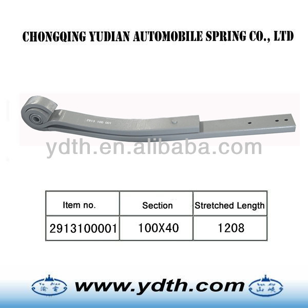 1.material: SUP11A 2.WidthxThicness: 100X40 3.the sizes: 1208 Z type leaf springs are made as follows: 1.Shearing of flat bar 2.Parabolic Rolling 3.Center hole punching / Drilling 4.End Heating process forming (hot & cold process) a.Eye Forming / Wrapper Forming b.Diamond cutting / end trimming / width cutting / end tapering c.End punching / end grooving / end bending / end forging / eye grinding d.Center hole punching / Drilling / nibbing 5.Make Z 6.Heat Treatment a. Heating b. Camber forming c. Quenching d. Tempering 6.Surface preparation a. sand blasting b. Painting 7.Eye bush preparation process a. Eye reaming / eye boring b. Bush insertion c. Bush reaming 8.Assemble a. Presetting & load testing b. Paint touch-up c. Marking & packing