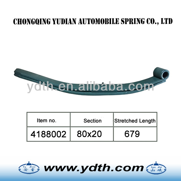 1.material: SUP9 2.WidthxThicness: 80x20 3.the sizes: 679 Parabolic springs are made as follows: 1.Shearing of flat bar 2.Parabolic Rolling 3.Center hole punching / Drilling 4.End Heating process forming (hot & cold process) a. Eye Forming / Wrapper Forming b. Diamond cutting / end trimming / width cutting / end tapering c. End punching / end grooving / end bending / end forging / eye grinding d. Center hole punching / Drilling / nibbing 5.Heat Treatment a. Heating b. Camber forming c. Quenching d. Tempering 6.Surface preparation a. sand blasting b. Painting 7.Eye bush preparation process a. Eye reaming / eye boring b. Bush insertion c. Bush reaming 8.Assemble a. Presetting & load testing b. Paint touch-up c. Marking & packing